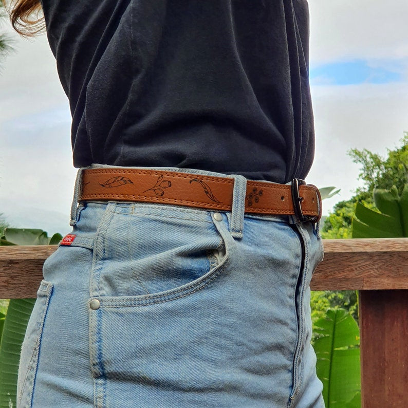Genuine leather belt engraved with eucalyptus leaves, blossoms and gumnuts 💚🍃. Gunmetal silver buckle.