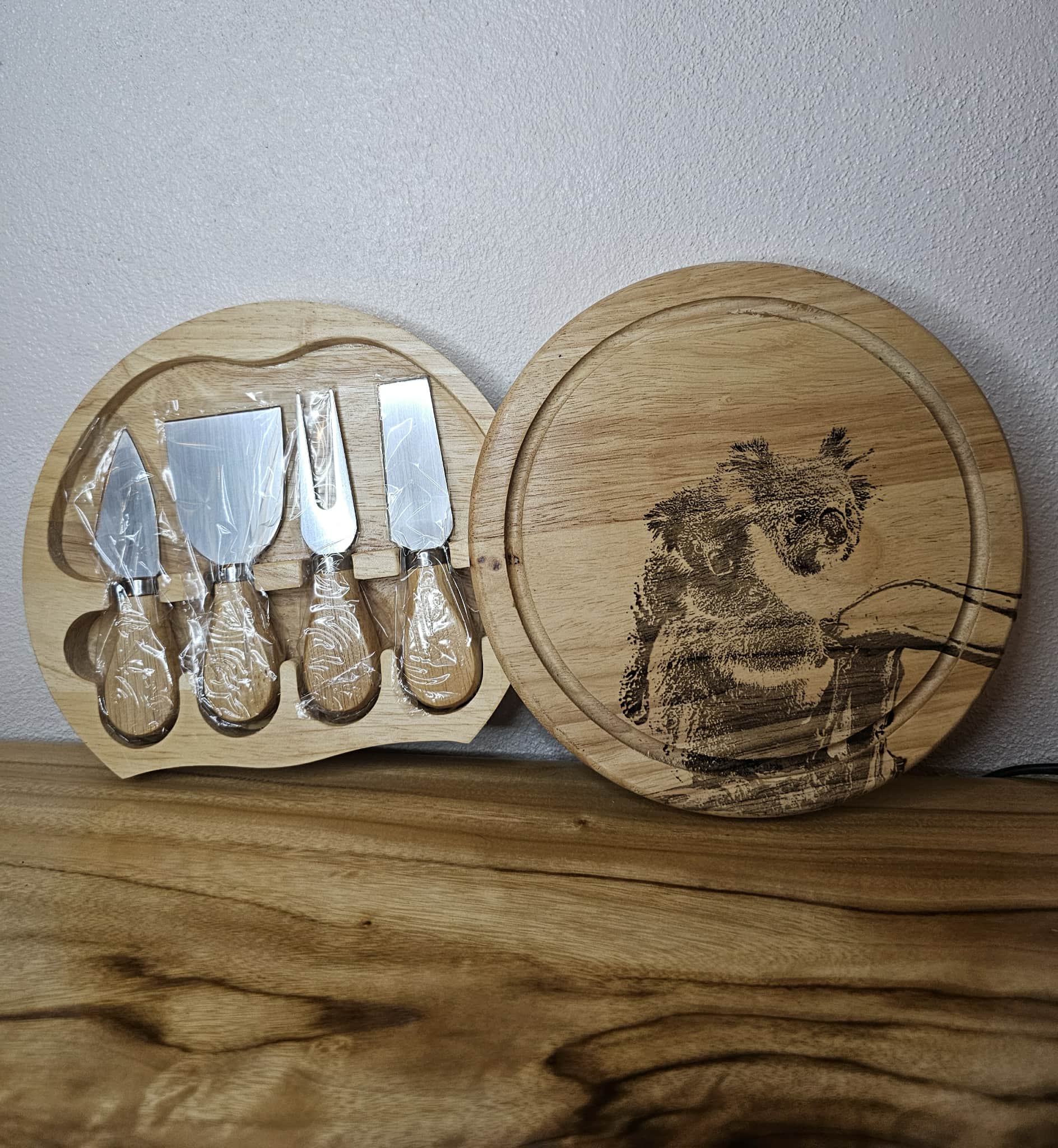 Koala & Joey Australian Native Engraved Cutting Chopping Cheese Serving Board with 4 Knives Set